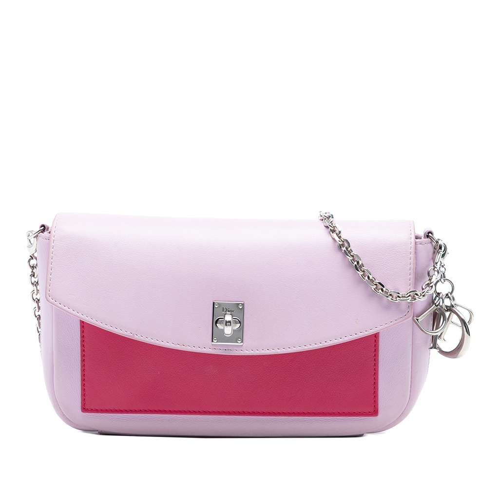 This crossbody bag features a leather body, a silver-tone curb chain link strap, a front flap with turn lock closure, exterior front and back slip pockets, and interior slip pockets. Exterior front has been repainted.
