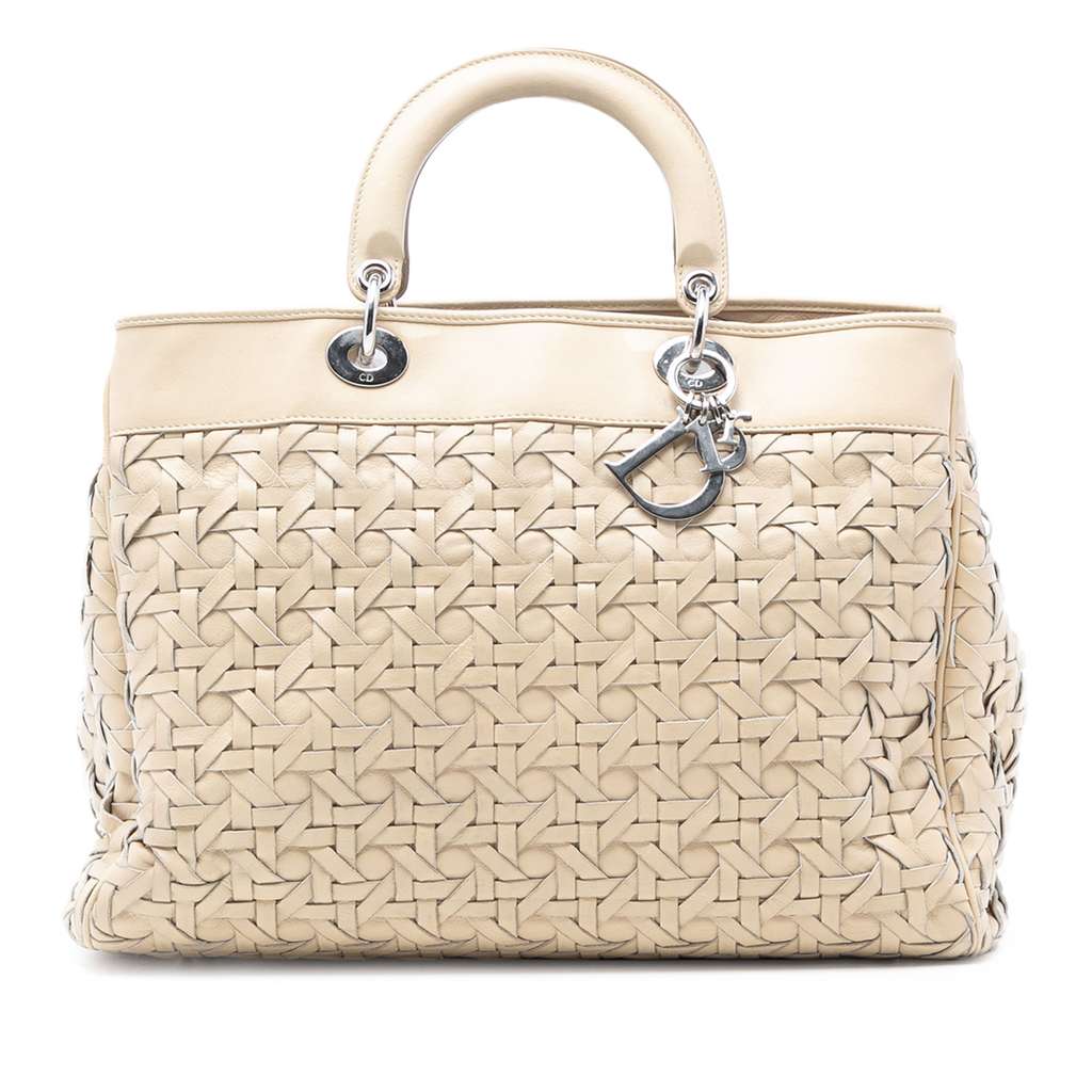 This satchel features a woven leather body, structured leather handles, an open top, an interior zip compartment, and interior zip and slip pockets. The bottom and corners were repainted.