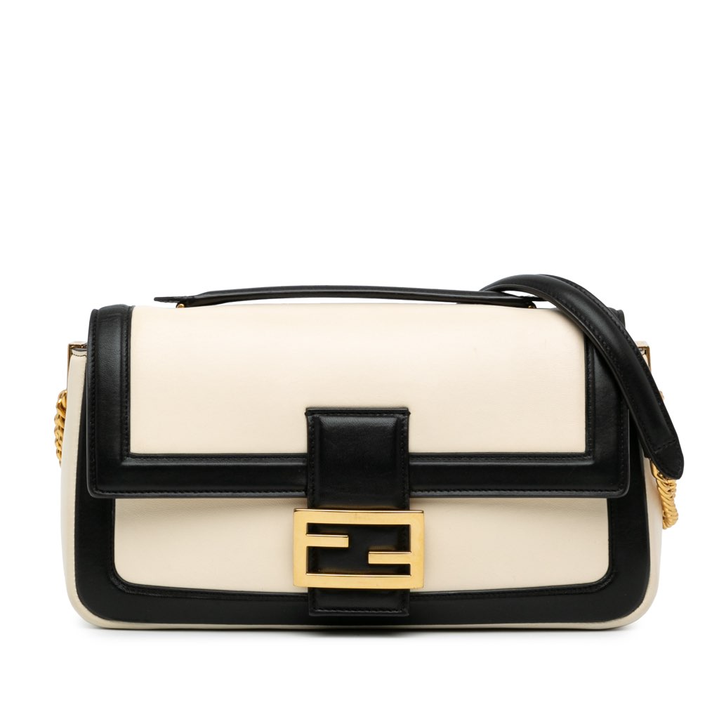 This shoulder bag features a leather body, chain link shoulder straps with leather guard, a flap with magnetic snap closure, and an interior zip pocket.