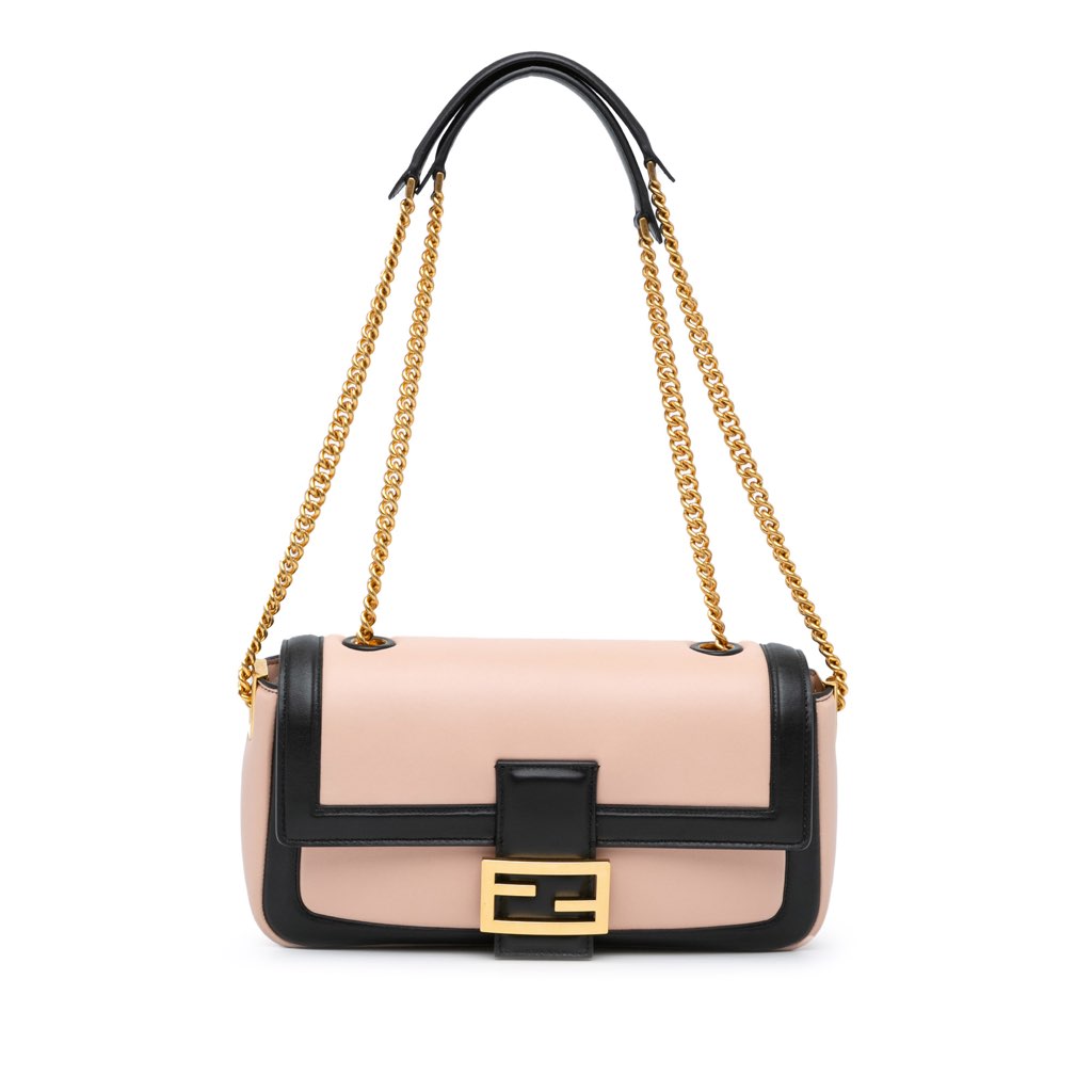 This shoulder bag features a bicolor leather body, chain link shoulder straps with leather guard, a flap with magnetic snap closure, and an interior zip pocket.
