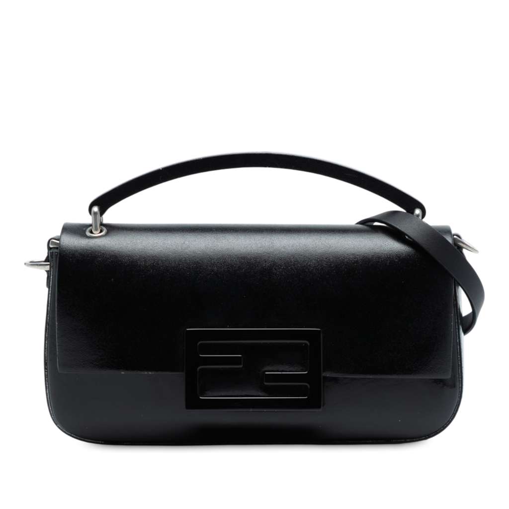 This satchel features patent and calf leather body, a flat leather top handle, a detachable flat leather strap, a front flap with magnetic snap closure, and an interior slip pocket.