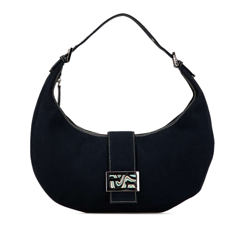 This shoulder bag features a canvas body, flat leather strap, top zip closure with flat strap and magnetic closure and interior zip pocket.