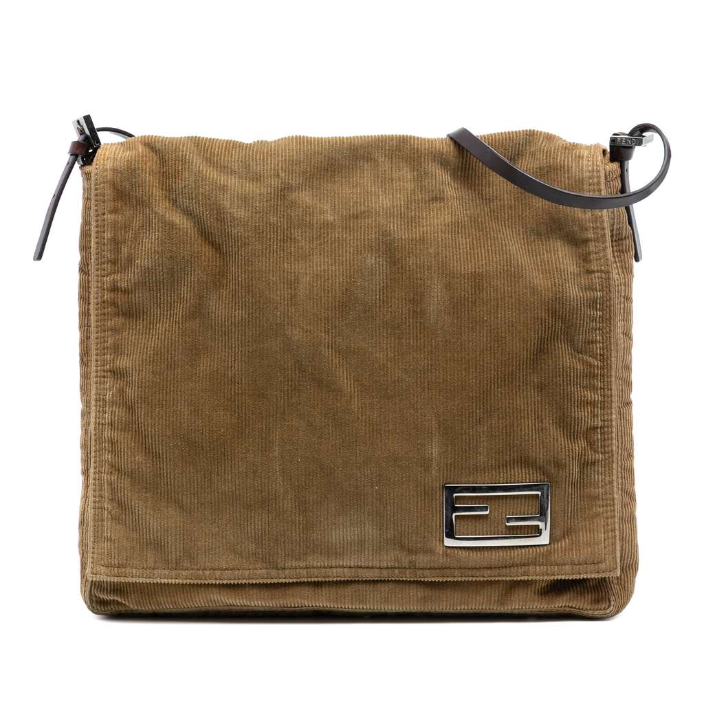 This shoulder bag features a corduroy body, flat leather straps, a front flap with magnetic snap closure, and an interior zip pocket.