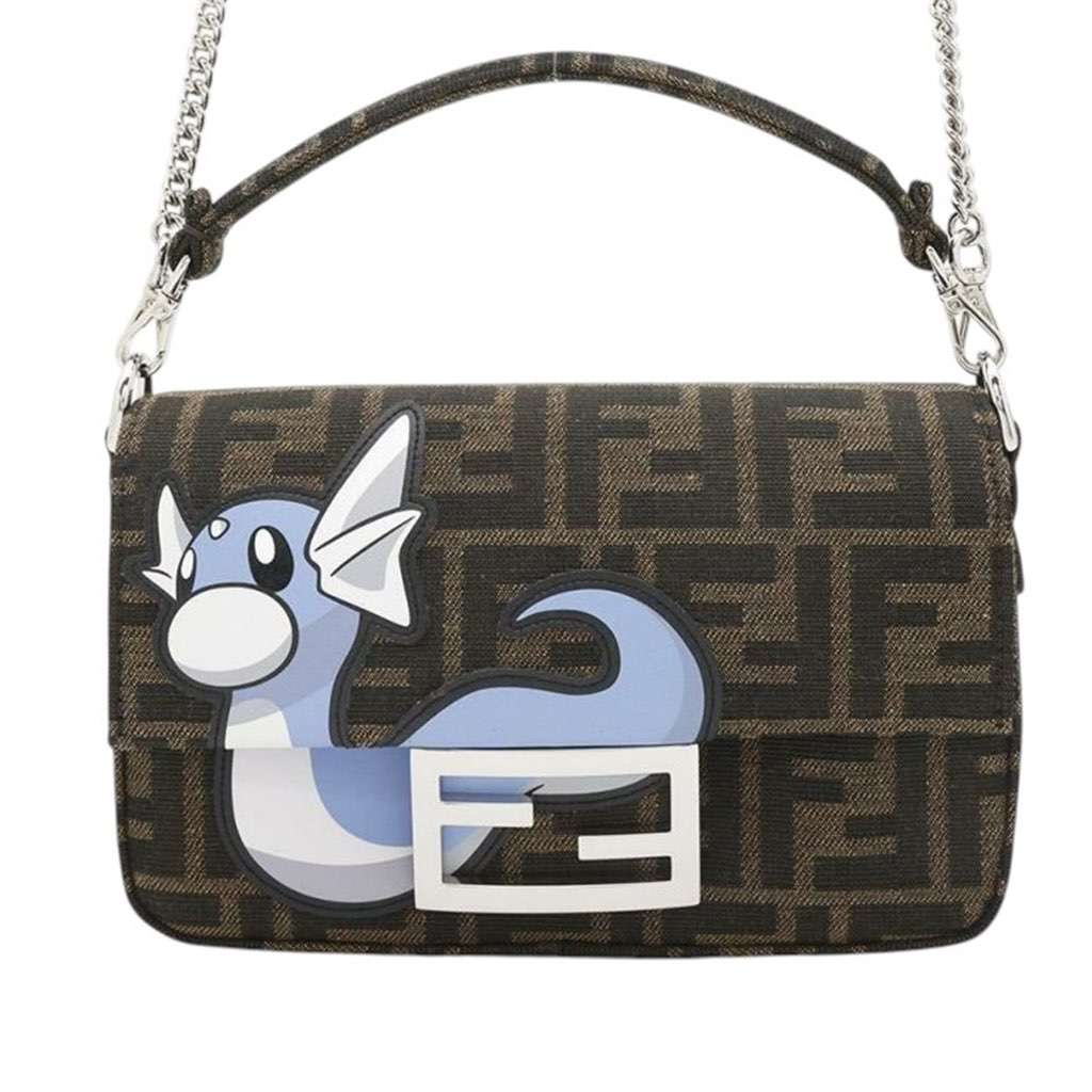 The Baguette features a canvas body with front leather applique, a detachable flat leather top handle, a detachable chain link strap with leather guard, a front flap with magnetic snap closure, and an interior slip pocket.