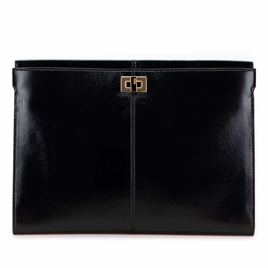 The Peekaboo features a leather body, an open top with turn lock closure, and interior zip and slip pockets.