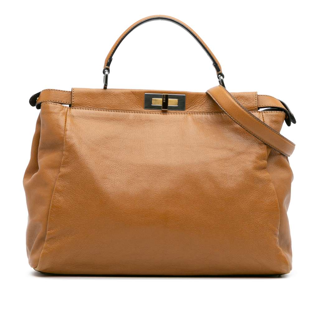 The Peekaboo Iconic features a leather body, a flat leather top handle, a detachable and adjustable flat leather shoulder strap, an open top with twist closure, and an interior zip pocket.
