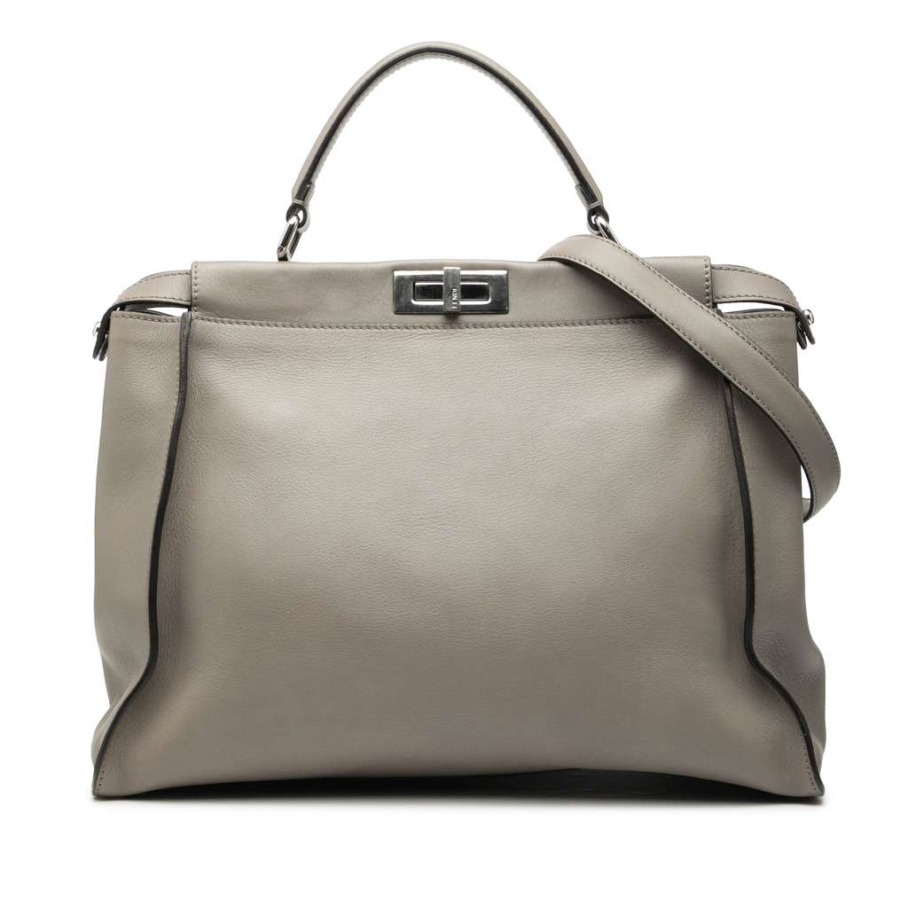 The Peekaboo features a leather body, a flat leather handle, a detachable flat leather strap, an open top with twist lock closures, and an interior zip pocket.