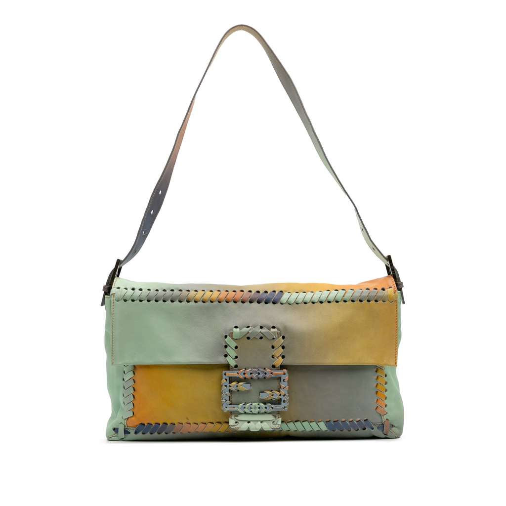 This crossbody bag features a multicolor leather body with whipstitch details, a flat leather shoulder strap, a flap with magnetic snap closure, and an interior zip pocket.