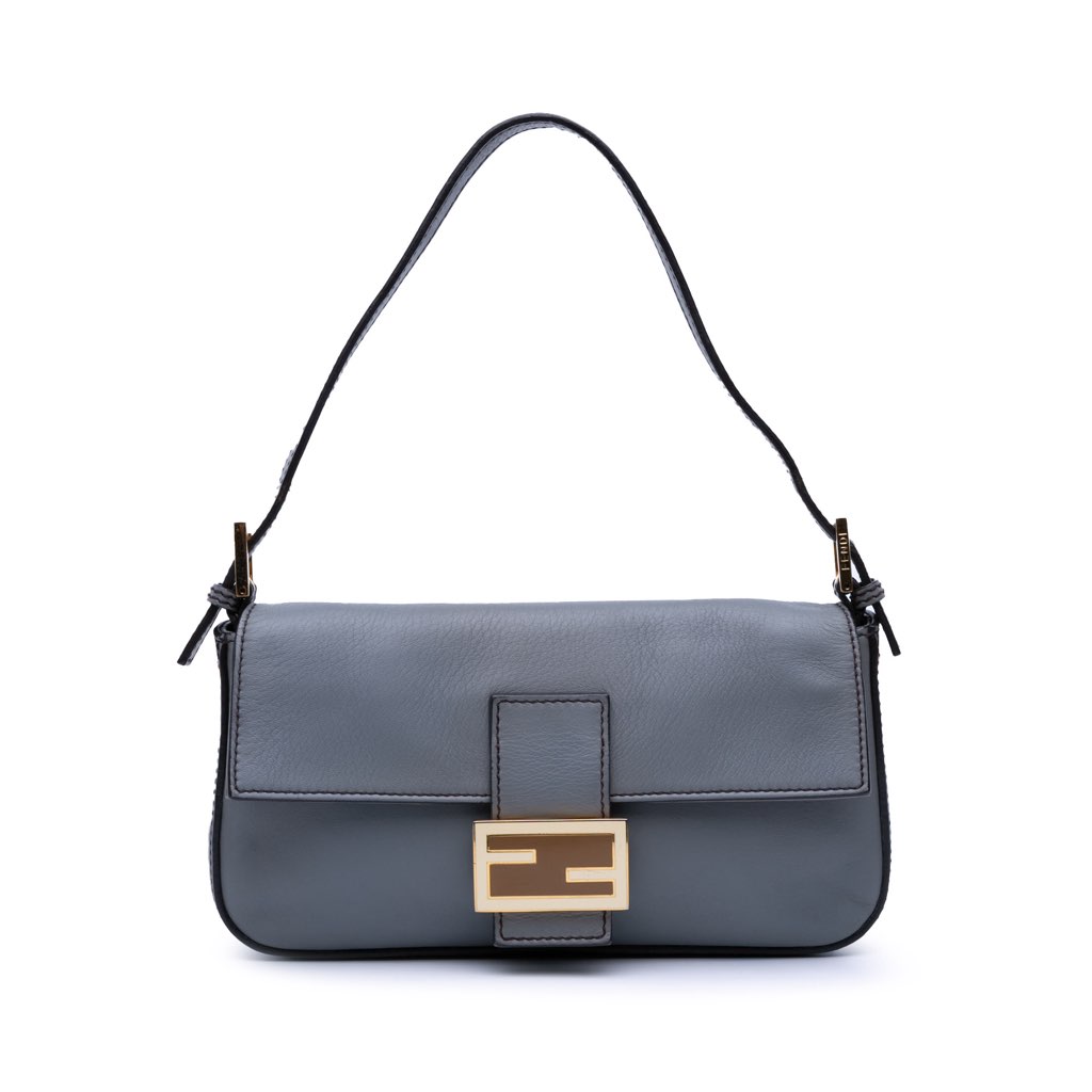 The Baguette features a leather body, a flat leather handle, a front flap with magnetic snap button closure, and an interior zip pocket.