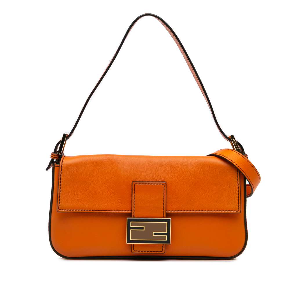 The Baguette features a leather body, a flat leather handle, a detachable flat leather strap, a front flap with magnetic snap button closure, and an interior zip pocket. The front and the corners were repainted.