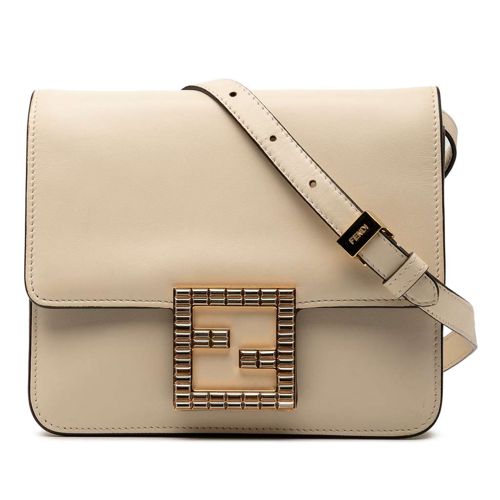 The Fab crossbody bag features a leather body, an adjustable flat shoulder strap, a front flap with crystal embellished logo and snap closure, and interior card slots.