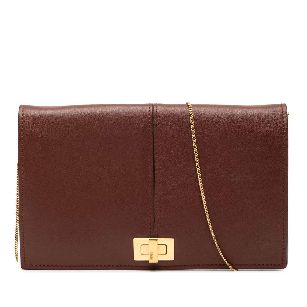 This crossbody bag features a leather body, a chain link strap, and a front flap with twist-lock closure.