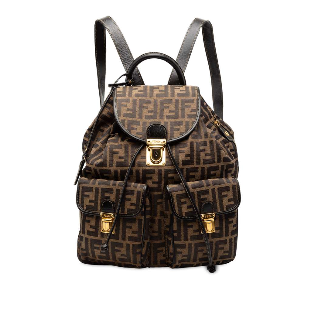This backpack features a canvas body with leather trim, a rolled leather top handle, adjustable flat leather back straps, a top flap with buckle closure, a drawstring closure, exterior side zip and flap pockets, and an interior zip pocket.