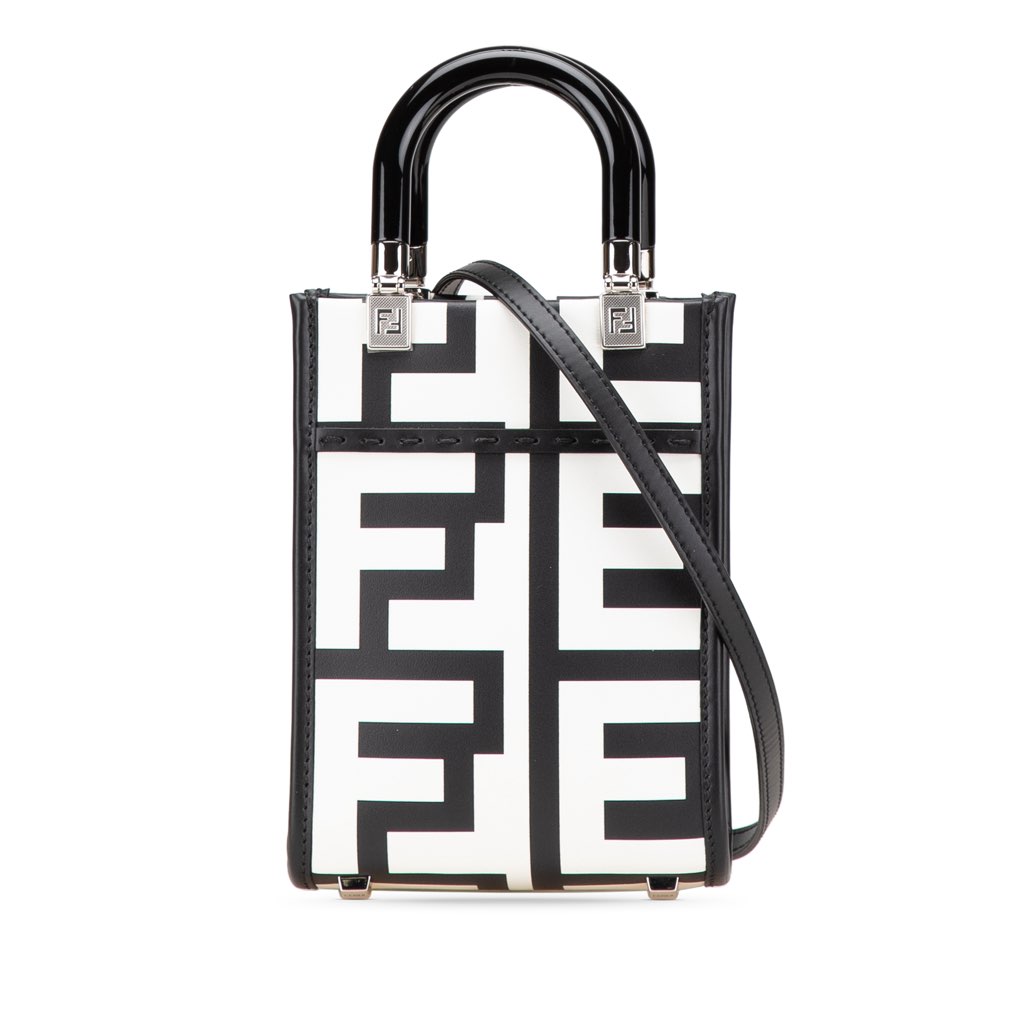 The Sunshine Shopper Tote features a leather body, rolled acrylic top handles, a detachable flat leather shoulder strap, and an open top.