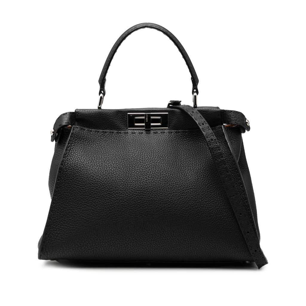 The Peekaboo features a leather body, a flat leather handle, a detachable and adjustable flat leather strap, an open top with twist closure, and an interior zip closure.