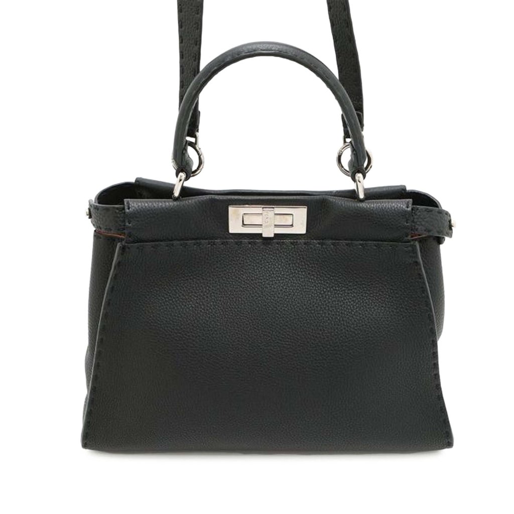 The Peekaboo features a leather body, a flat leather handle, a detachable flat strap, an open top with twist closure, and an interior zip closure.