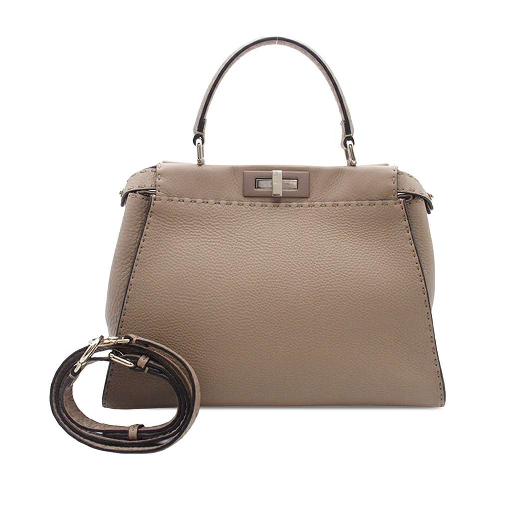 The Peekaboo Iconic features a leather body, a flat leather handle, a detachable flat leather strap, an open top with twist closure, and an interior zip pocket.