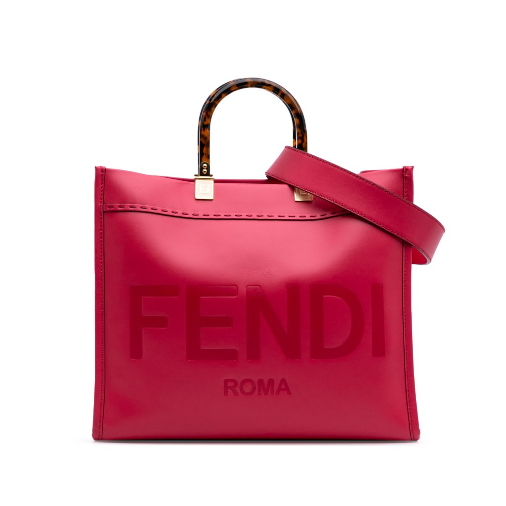 The Sunshine Shopper Tote features a leather body, flat acrylic top handles, a detachable flat leather shoulder strap, and an open top.