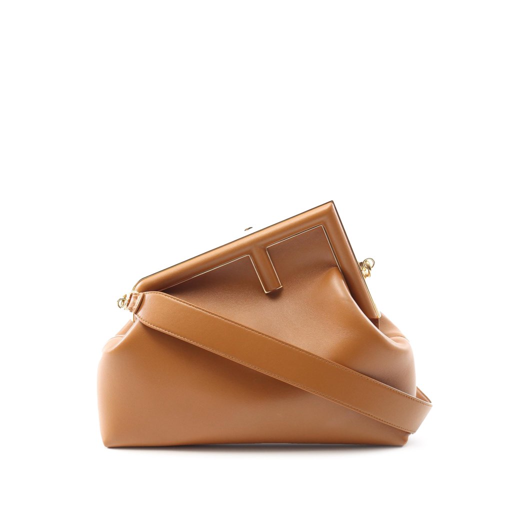 This shoulder bag features a nappa leather body, a detachable flat leather shoulder strap, and a top clasp closure.
