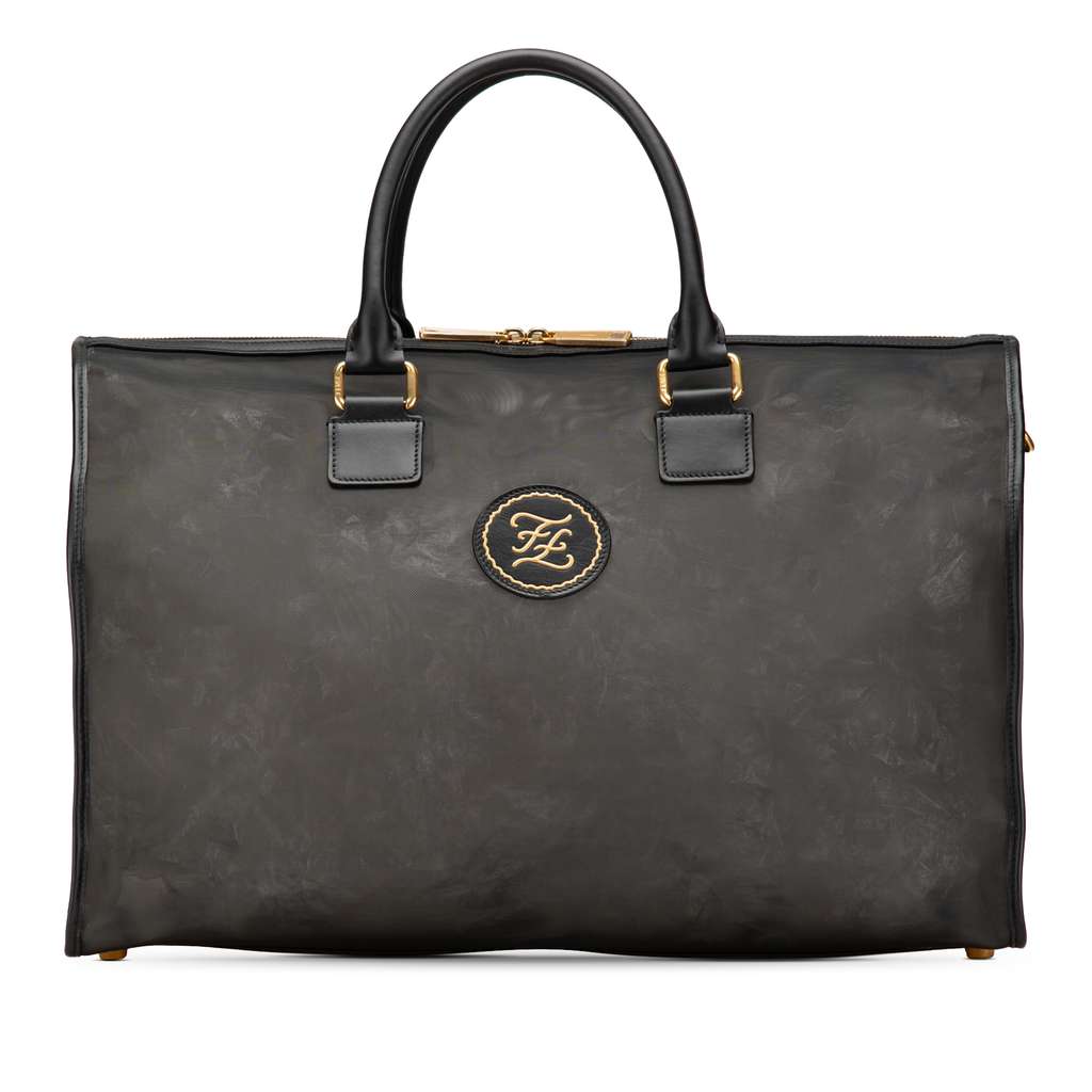 This duffle bag features a mesh body with leather trim, rolled leather handles, and a top zip closure.