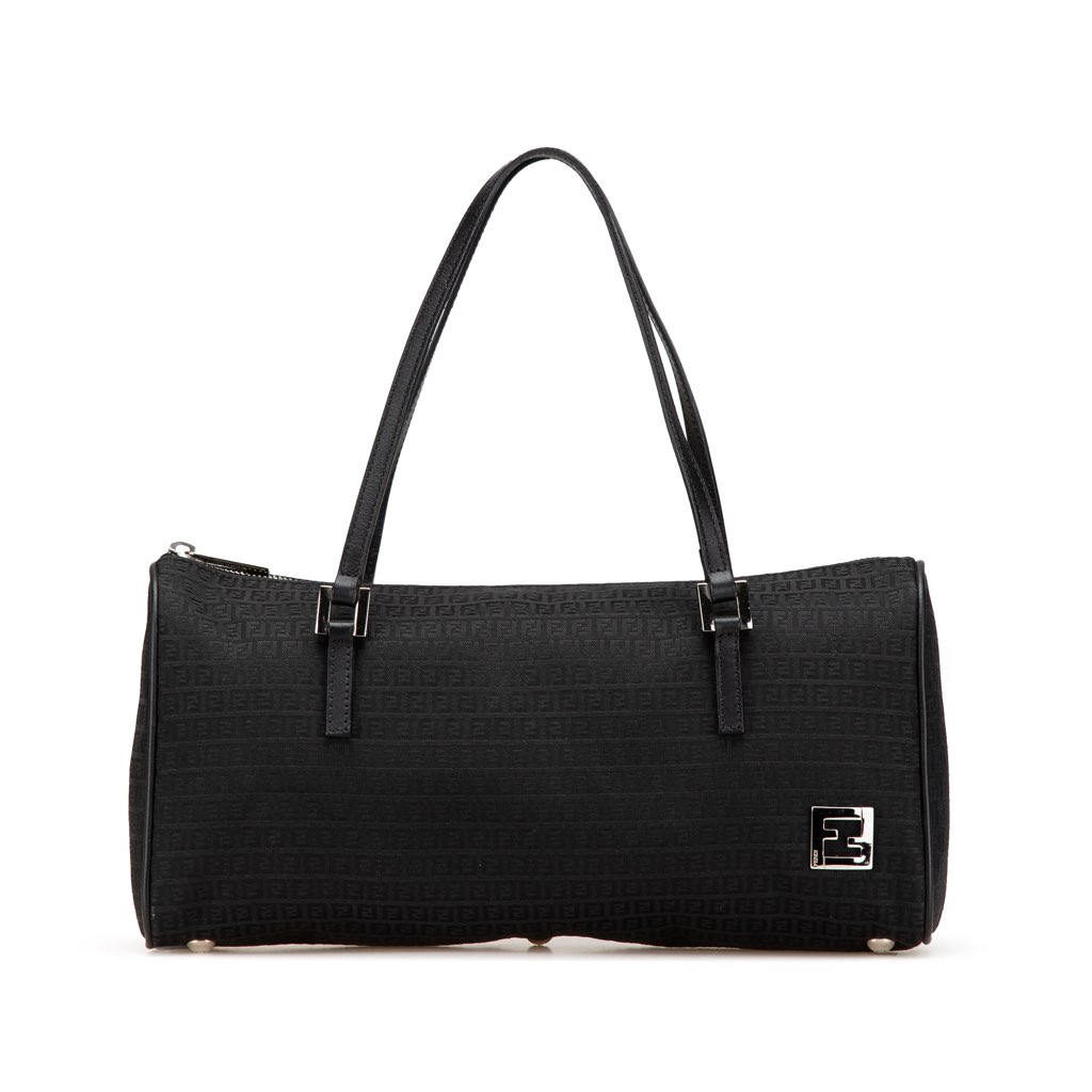This handbag features a canvas body with leather trim, flat leather handles, a top zip closure, and an interior slip pocket.