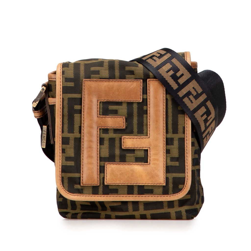 This crossbody bag features a canvas body with leather trim, a flat shoulder strap, a front flap with snap closure, and an interior zip pocket.