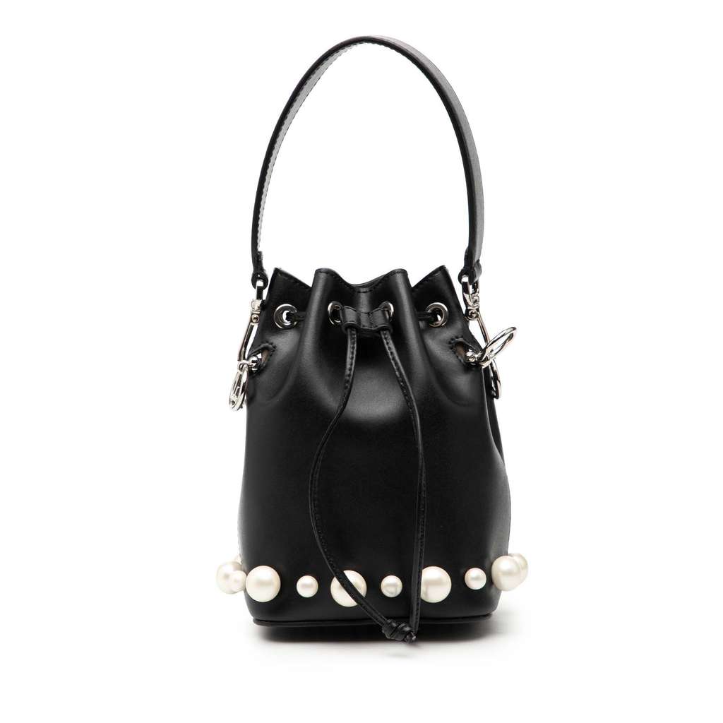 The Mon Tresor features a leather body with faux pearl embellishments, a flat leather top handle, and an open top with a drawstring closure.