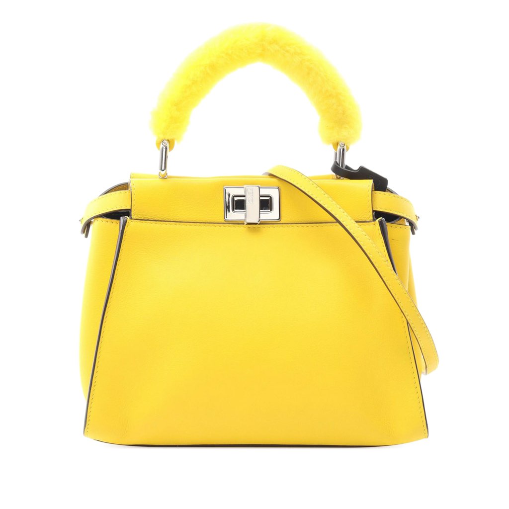 The Iconic Peekaboo features a leather body, a rolled fur top handle, a detachable leather strap, an open top with twist lock closure, and interior zip and slip pockets.