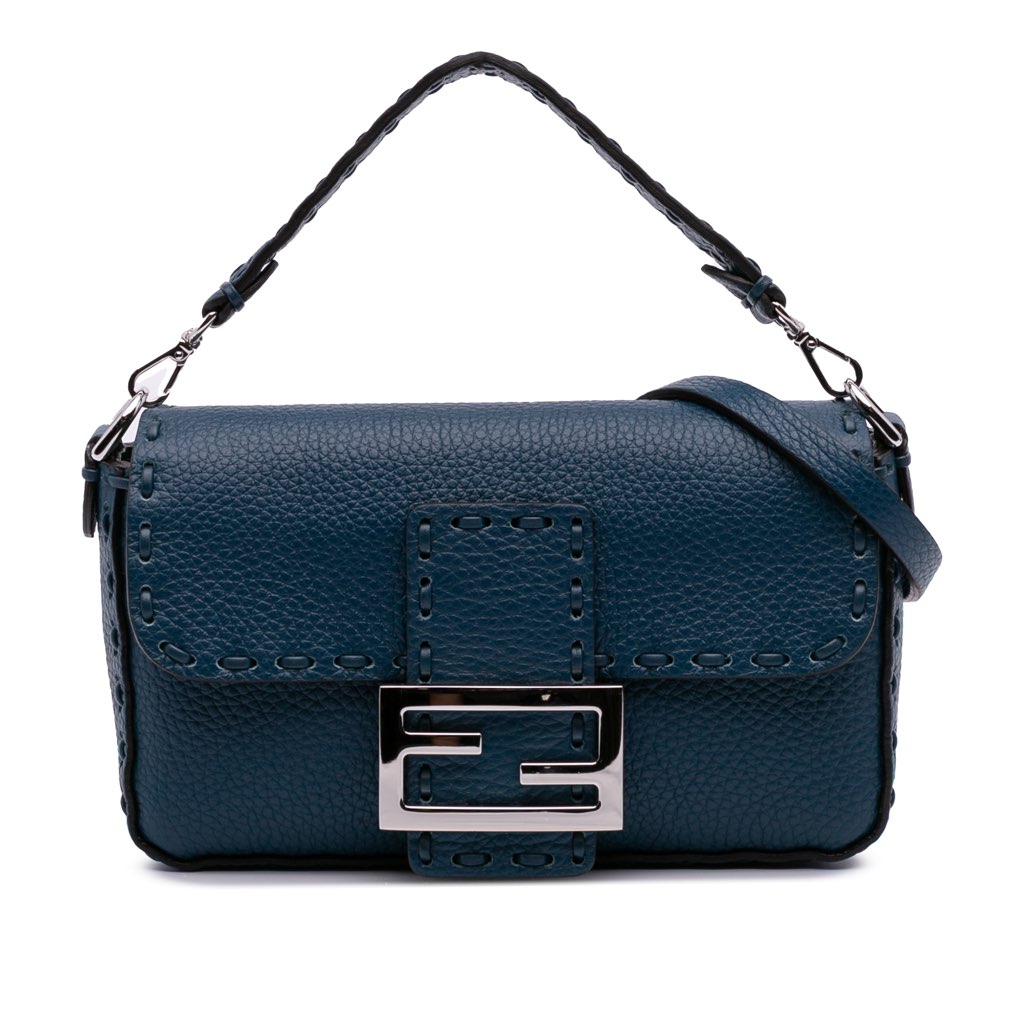 This satchel features a leather body, a detachable flat leather handle, a detachable flat leather shoulder strap, a flap with magnetic snap closure, and an interior slip pocket.