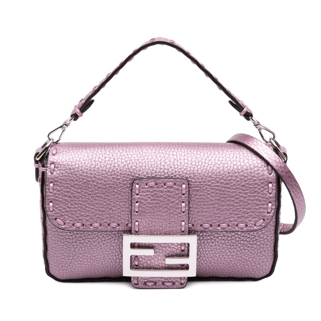 The Baguette features a leather body, a detachable flat leather handle, a detachable chain link and leather shoulder strap with leather guard, a front flap with magnetic snap closure, and interior slip pockets.