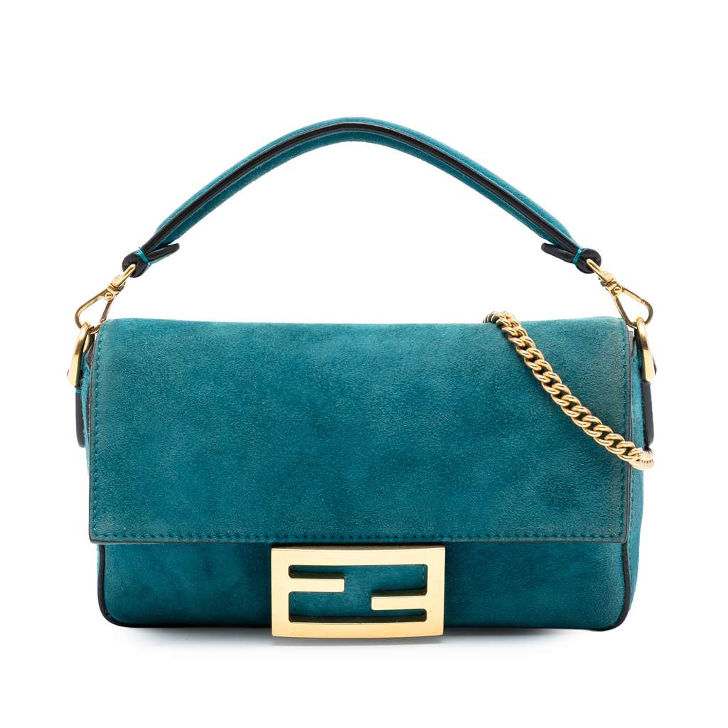 The Baguette features a suede body, a detachable handle, a detachable chain link shoulder strap with leather guard, a front flap with magnetic snap closure, and an interior zip pocket.