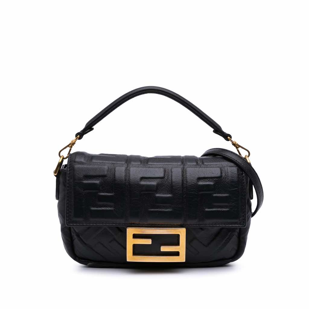The Baguette features an embossed leather body, a detachable flat leather handle, a detachable chain link strap with leather guard, a front flap with magnetic snap closure, and interior slip pockets.