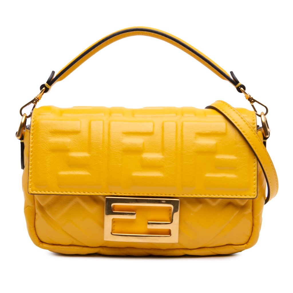 The Baguette features an embossed leather body, a detachable flat leather handle, a detachable chain link and leather shoulder strap, a front flap with magnetic snap closure, and interior slip pockets.