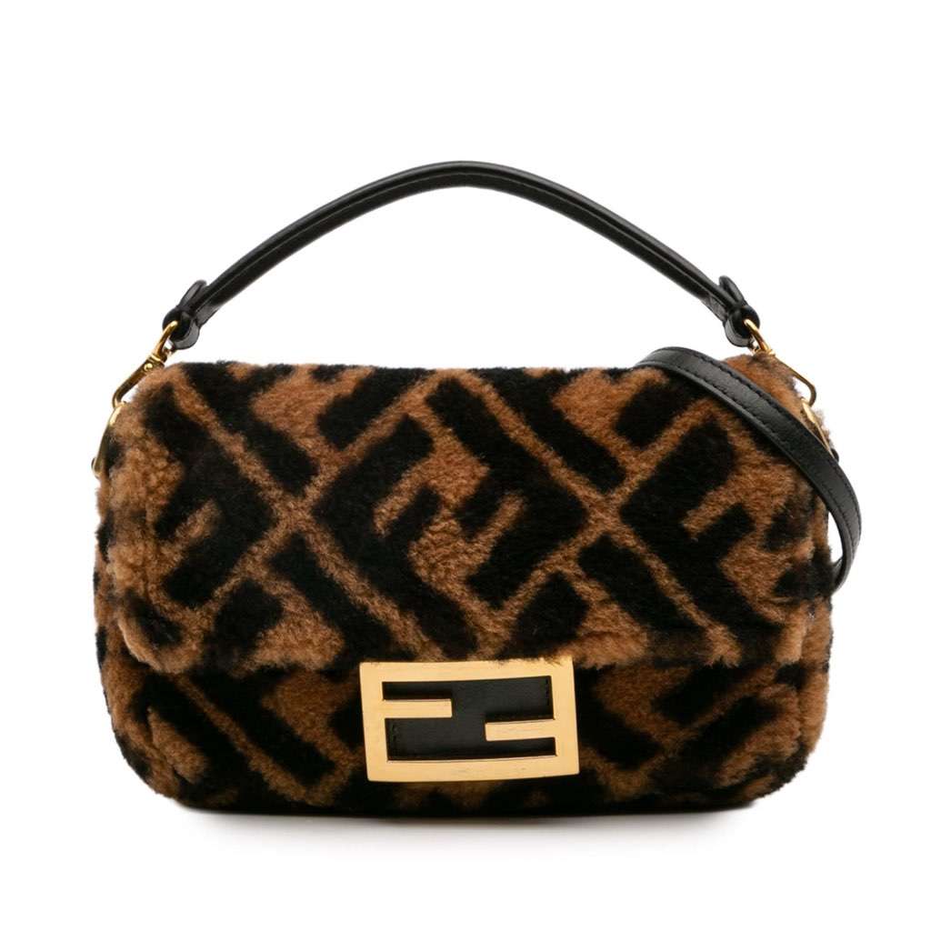 The Baguette satchel features a shearling fur body, a flat leather handle, a detachable chain link strap, a front flap with magnetic snap closure, and interior slip pockets.