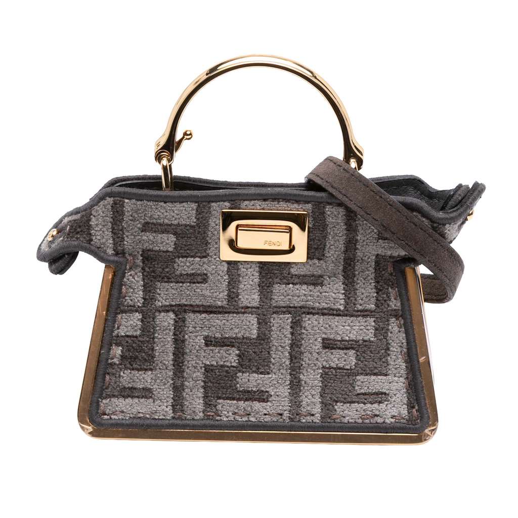 The Peekaboo ISeeU features a cashmere body with metal trim, a flat metal top handle, an adjustable and detachable flat leather strap, an open top with turn-lock closure, and an interior slip pocket.