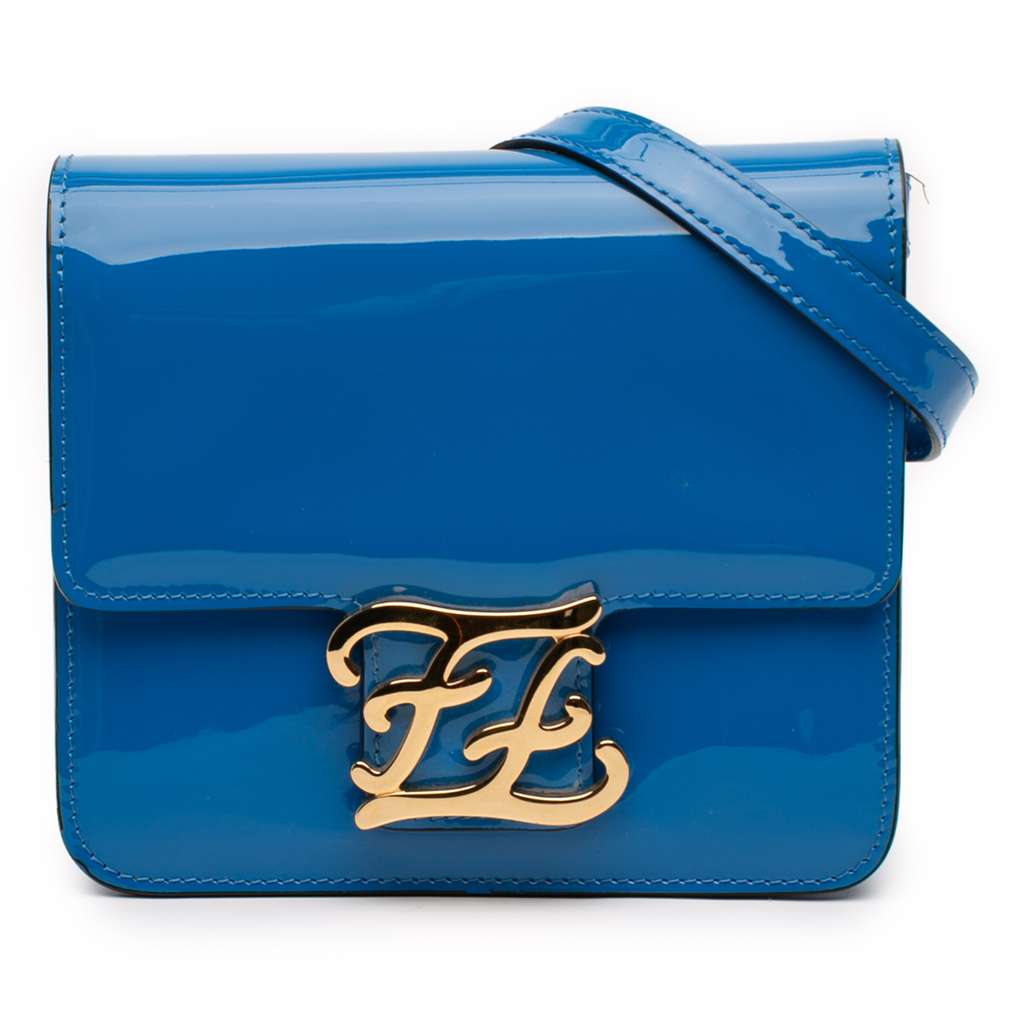 Fendi Patent Karligraphy Crossbody Blue Mini Leather
