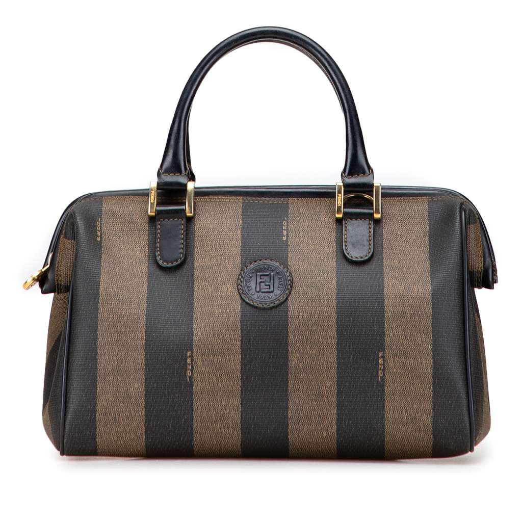 This boston bag features a coated canvas body with leather trim, rolled leather top handles, and a top zip closure.