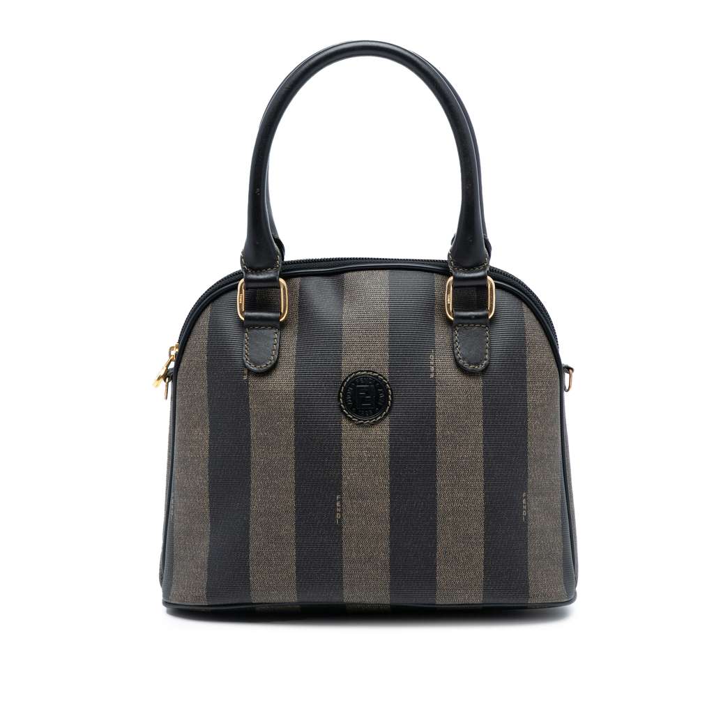 This satchel features a coated canvas body with leather trim, rolled leather handles, a top zip closure, and an interior zip pocket.