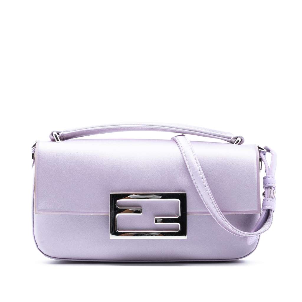 The Baguette features a satin body, a leather top handle, a detachable leather strap, a front flap with magnetic closure, and an interior slip pocket.
