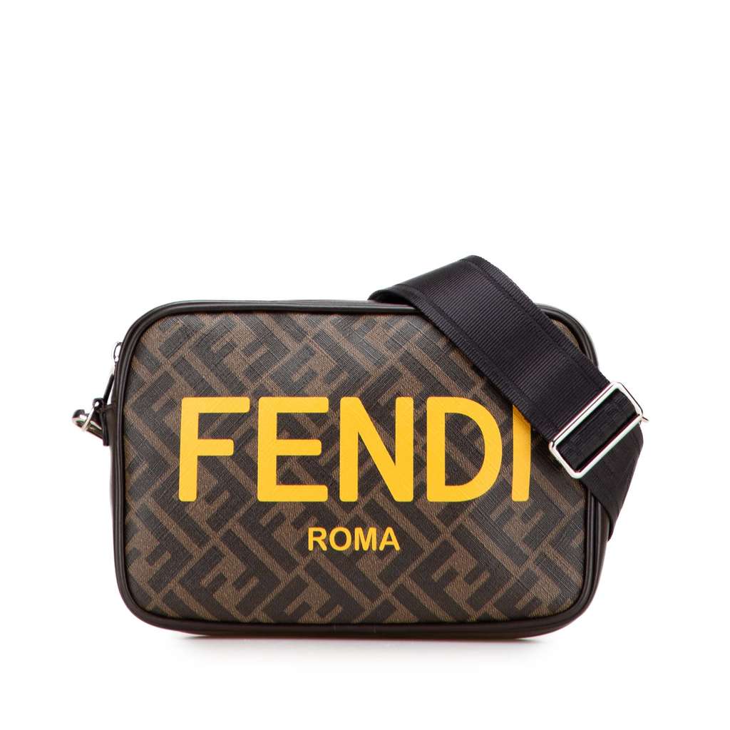 This crossbody bag features a coated canvas body with leather trim, an adjustable and detachable flat strap, a top zip closure, and an exterior slip pocket.