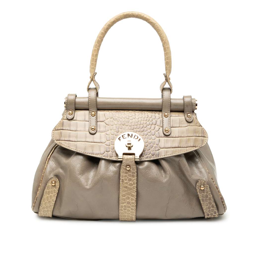 This handbag features a leather body with croc embossed trim, a rolled leather handle, a top flap with twist lock closure, and an interior zip pocket.