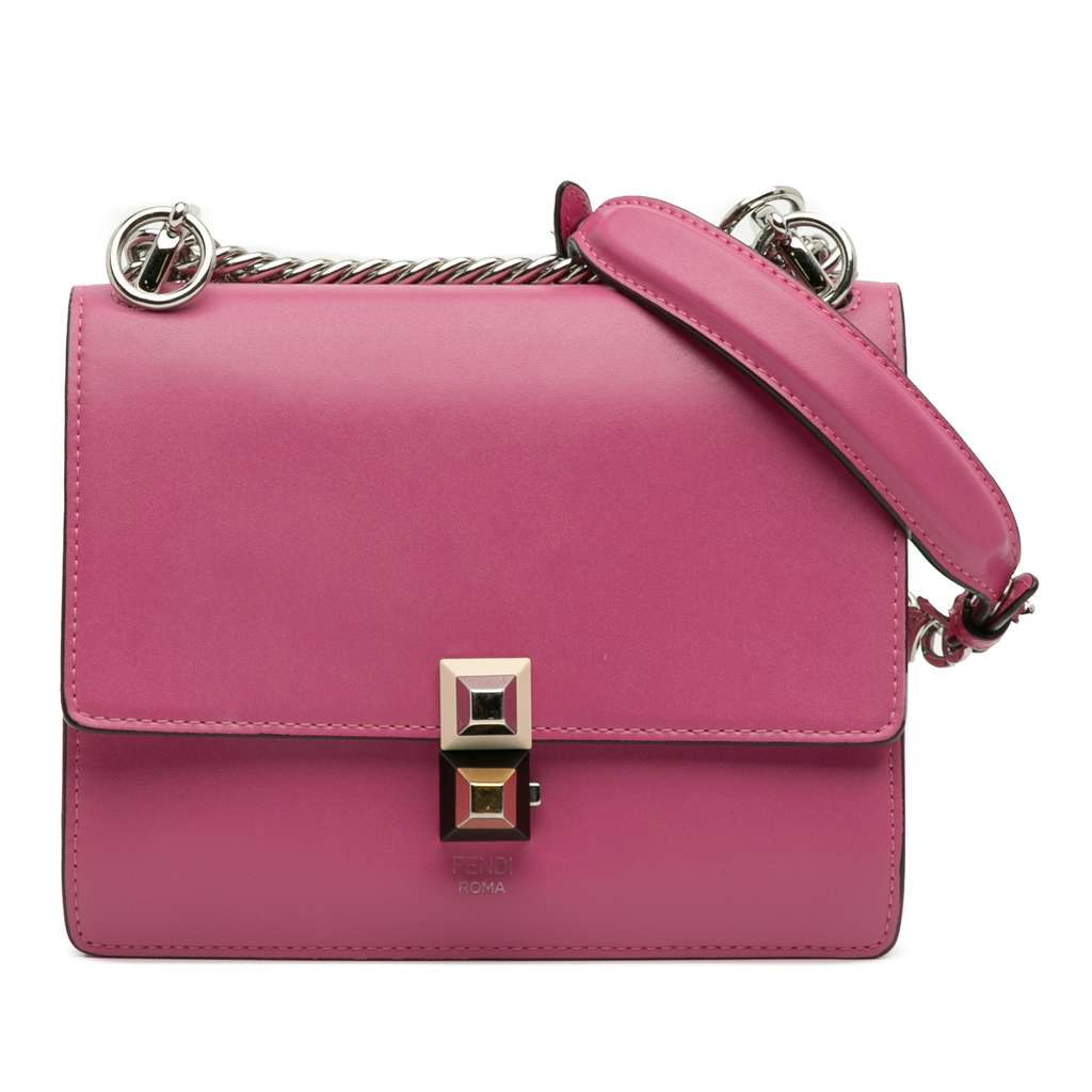 The Kan I features a leather body, a chain link shoulder strap with leather guard, a front flap with a push lock closure, and an interior slip pocket.