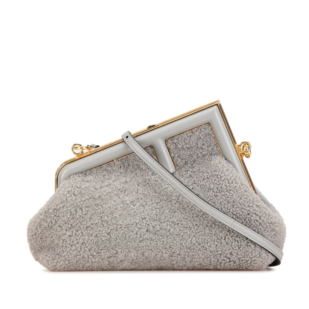 This crossbody bag features shearling body with gold-tone hardware, a detachable shoulder strap, and snap closure at top.