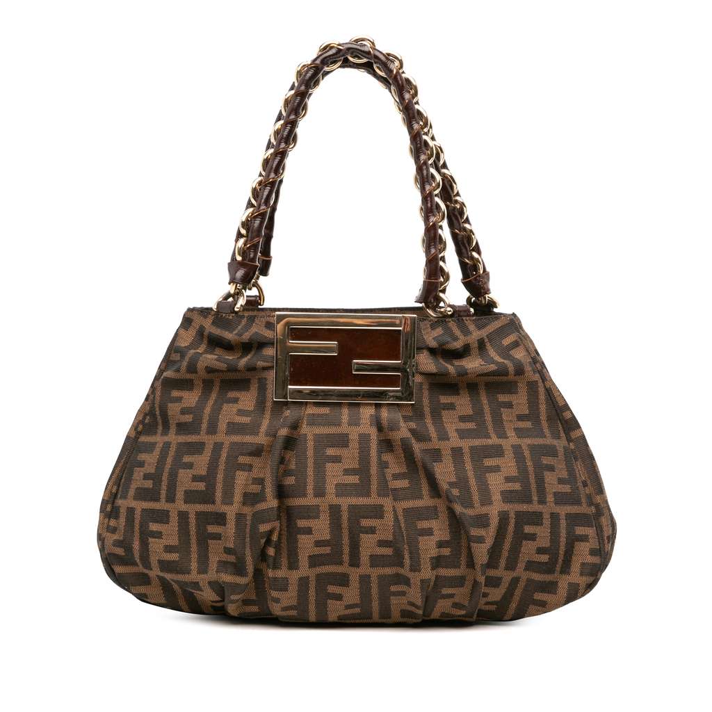 The Mia features a zucca canvas body, leather woven chain link shoulder straps, an open top, and interior zip and slip pockets.