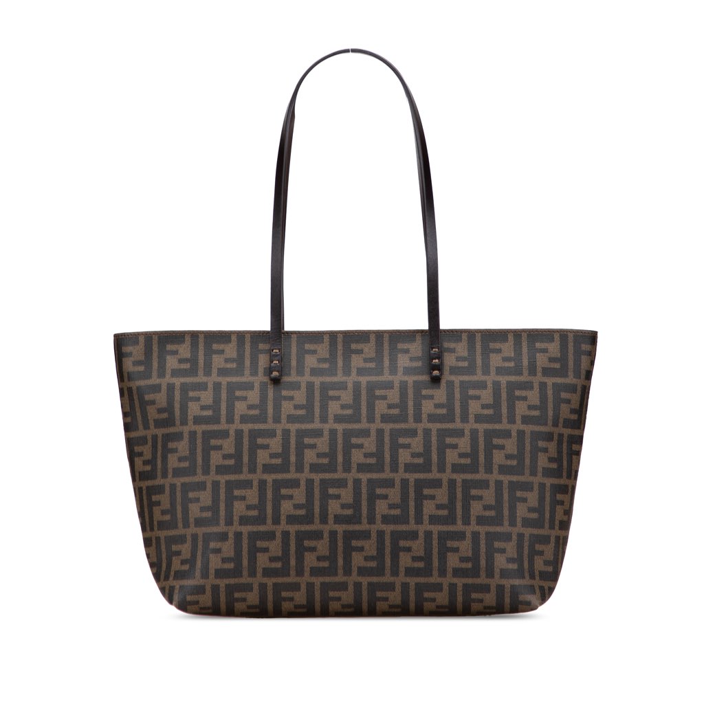 This tote bag features a coated canvas body, flat leather straps, a top zip closure, and an interior zip pocket.