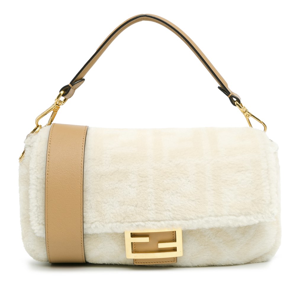 This satchel features a shearling fur body, a flat leather handle, a detachable flat leather strap, a front flap with magnetic snap closure, and an interior zip pocket.