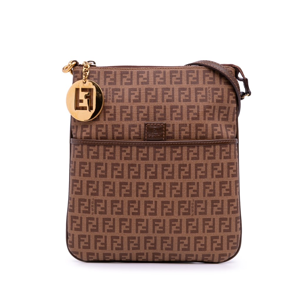 This crossbody bag features a coated canvas body with leather trim, an adjustable flat leather strap, a top zip closure, an exterior slip pocket, and an interior slip pocket.