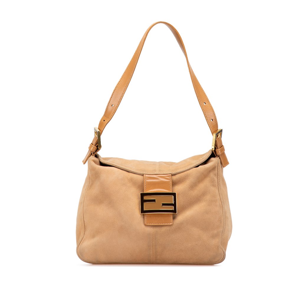 This shoulder bag features a suede body, an adjustable flat leather strap, a flap with strap and magnetic snap closure, and an interior zip pocket.