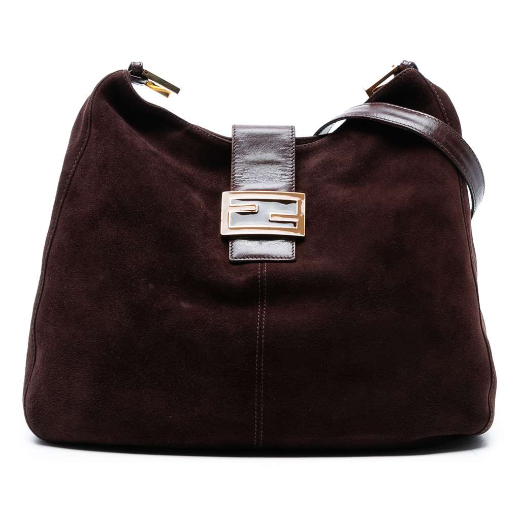 This shoulder bag features a suede leather body, a flat leather strap, a front strap with a magnetic closure, and an interior zip pocket.