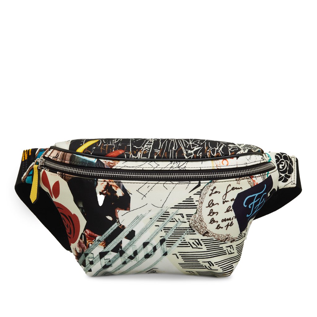 This belt bag features a printed nylon body, an adjustable flat belt strap with buckle closure, a front zip closure, and an interior zip pocket.